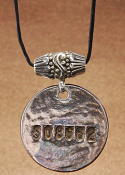 This individual pendant is stamped with a beloved pet's license number and contains ash. |